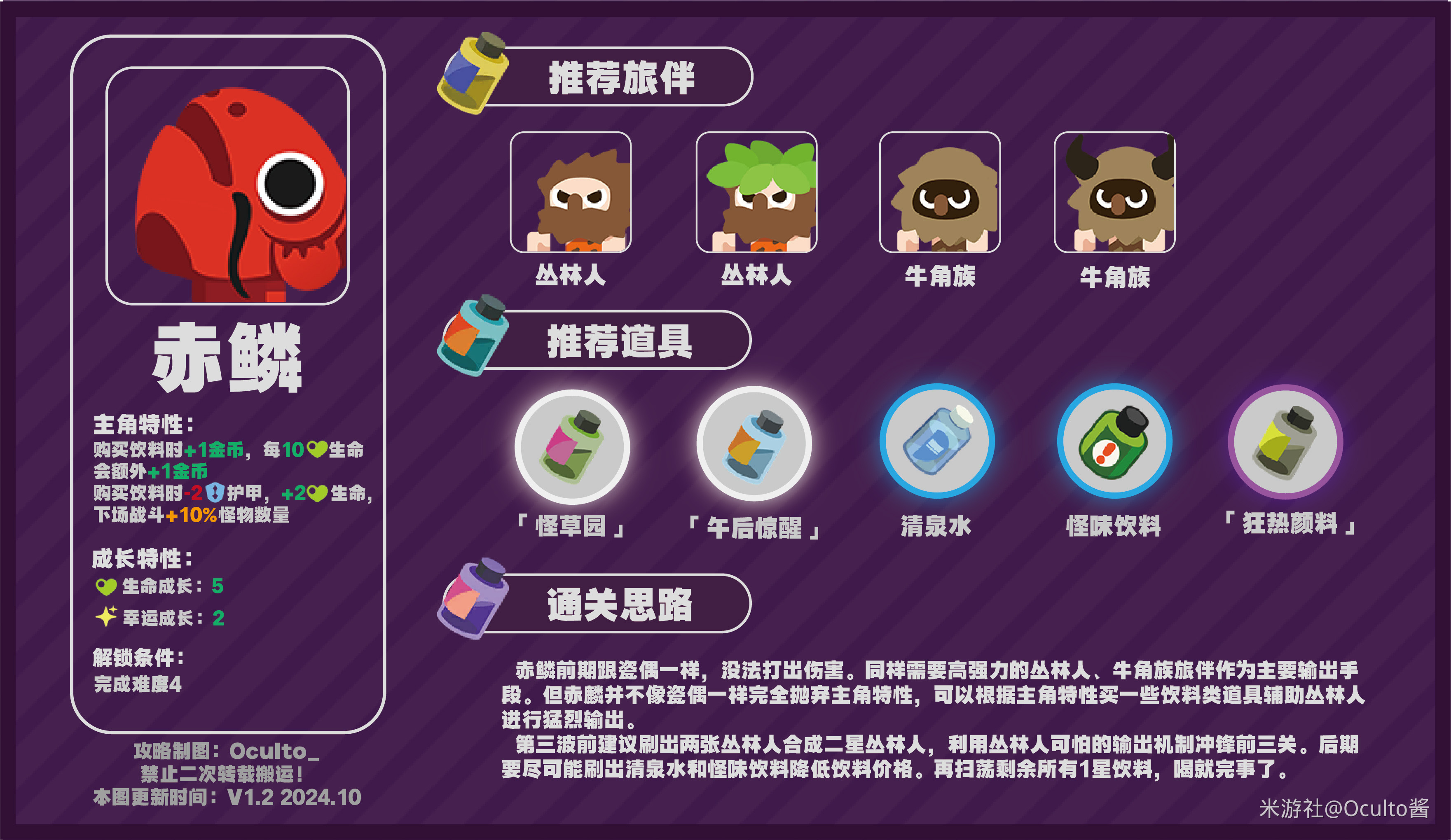 通关思路:赤鳞前期跟瓷偶一样,没法打出伤害。同样需要高强力的丛林人、牛角族旅伴作为主要输出手段。但赤麟并不像瓷偶一样完全抛弃主角特性,可以根据主角特性买一些饮料类道具辅助丛林人进行猛烈输出。