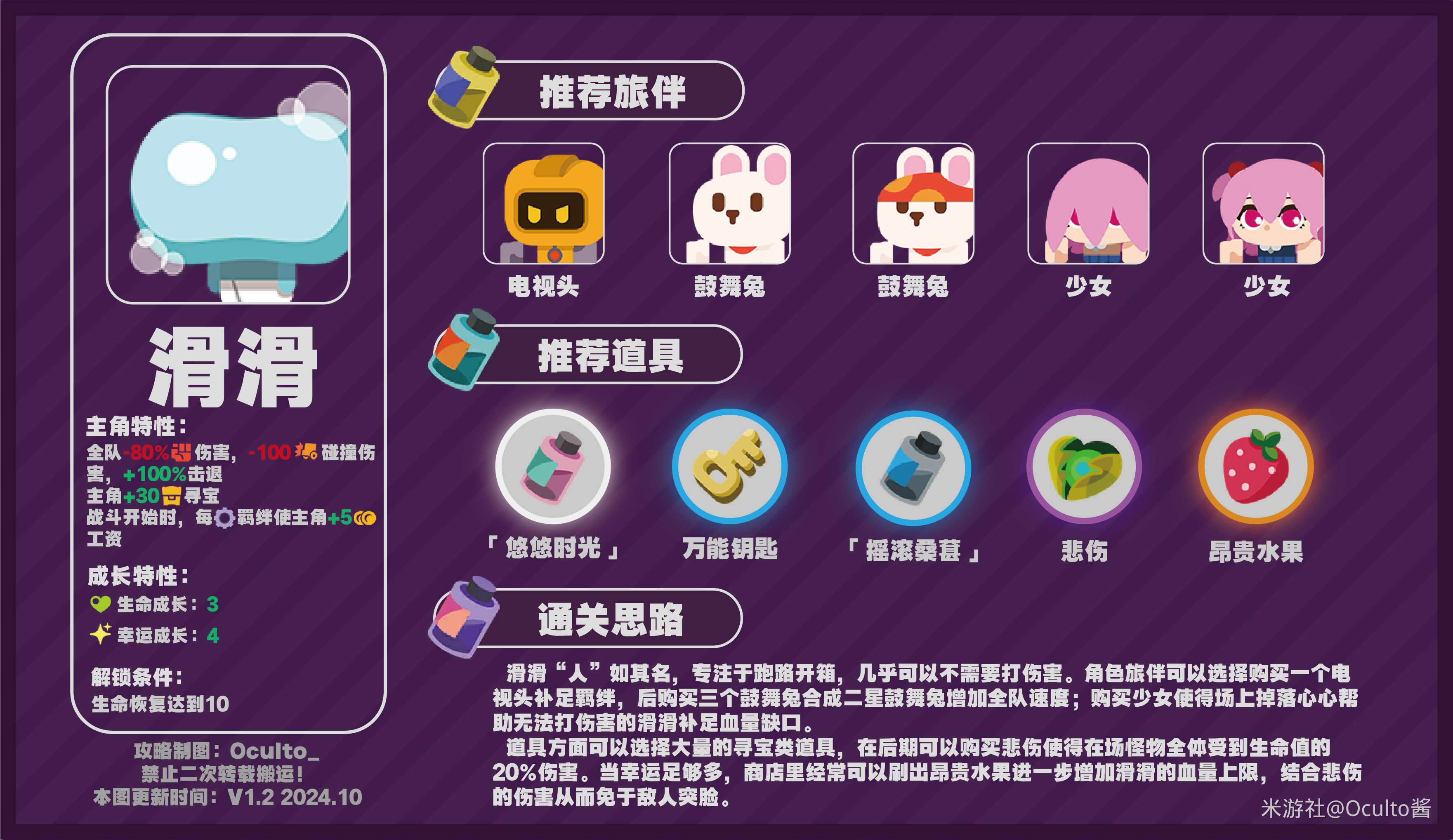 通关思路:滑滑“人”如其名,专注于跑路开箱,几乎可以不需要打伤害。角色旅伴可以选择购买一个电视头补足羁绊,后购买三个鼓舞兔合成二星鼓舞兔增加全队速度;购买少女使得场上掉落心心帮助无法打伤害的滑滑补足血量缺口。