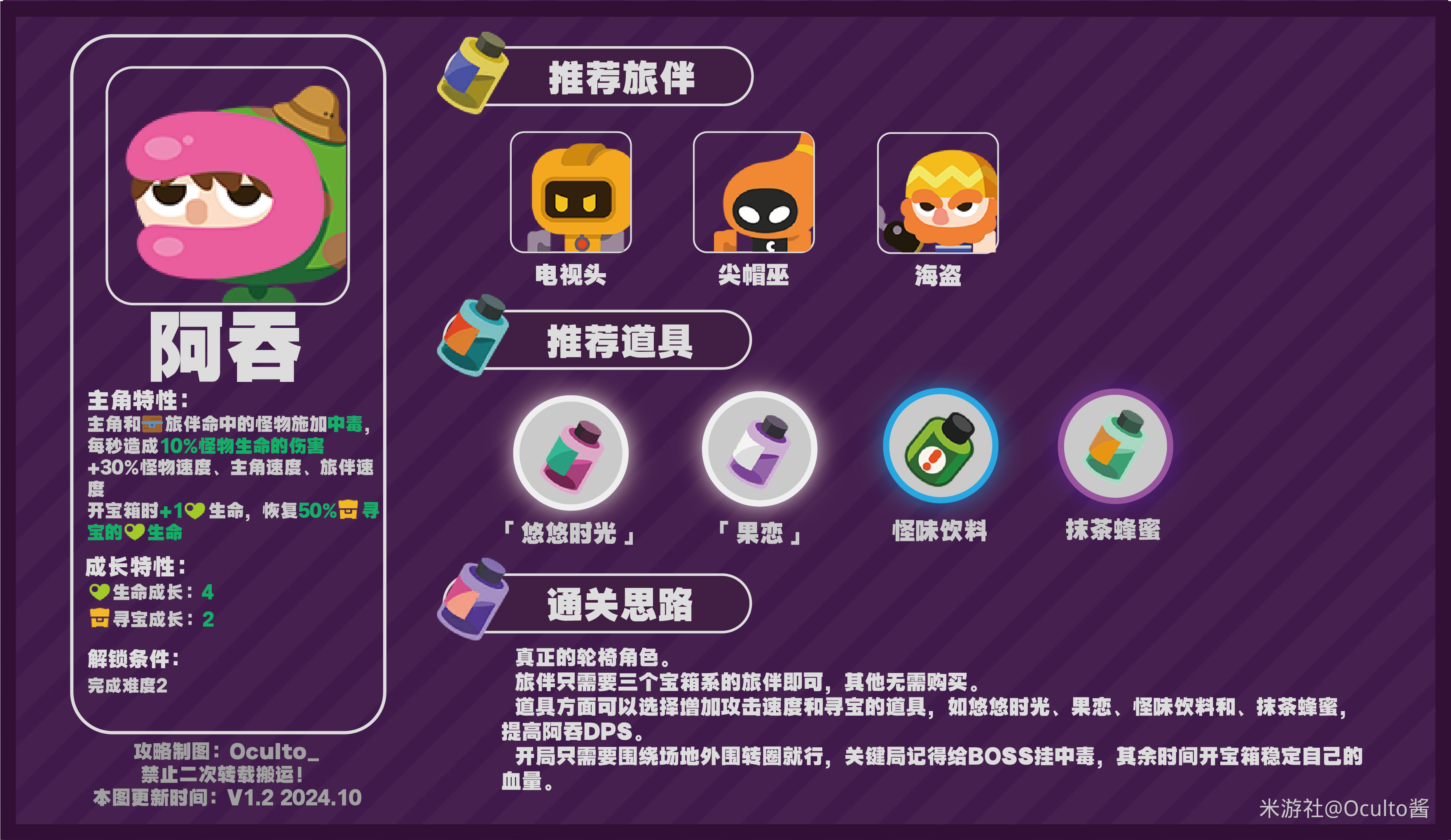 道具方面可以选择增加攻击速度和寻宝的道具,如悠悠时光、果恋、怪味饮料和、抹茶蜂蜜,提高阿吞DPS。