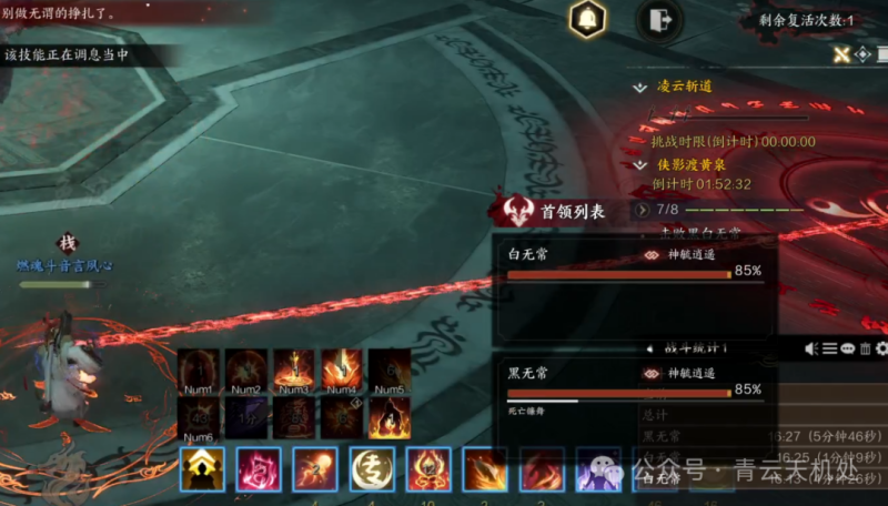 ⑥轮回无常·序:黑无常闪现到场边释放扩散的剑气,之后会连线1名玩家追击。白无常闪现到场边释放2条射线,