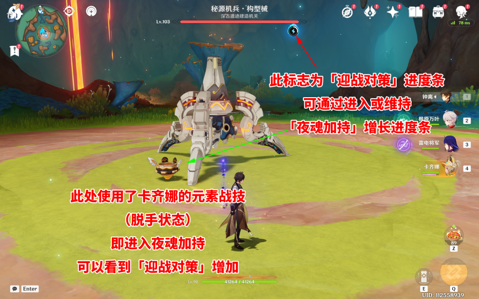 ②使用纳塔角色元素战技,进入并维持「夜魂加持」,积攒boss「迎战对策」条,积满后立刻释放