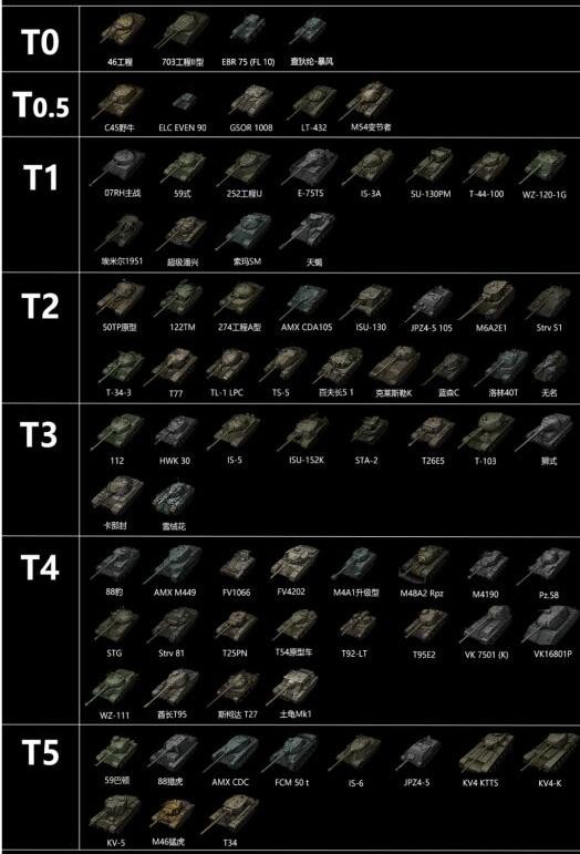 T1:O7RH主战、59式、252工程U、E-75TS、I5-3A、SU-130PM、T-44-100、WZ-120-1G、埃米尔1951、超极漫兴、索玛SM、天蝎