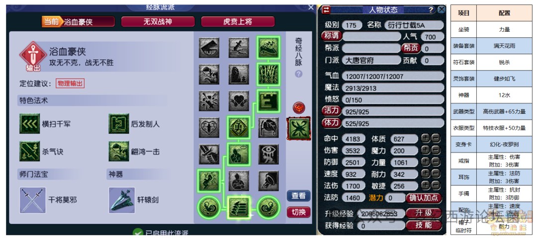 高速大唐装备套装:满天花雨灵饰属性:6伤害,6防御实战分析:力敏加点为主,同时兼顾血量。在《梦幻西游》电脑版中先手方具有极大的优势。力敏加点使得大唐拥有极快的速度,可以确保在对方输出之前出手,可以使用更加多样的战术。既能通过横扫千军提前压低对方血量,也能通过破碎无双打空蓝量使对方无法出手。