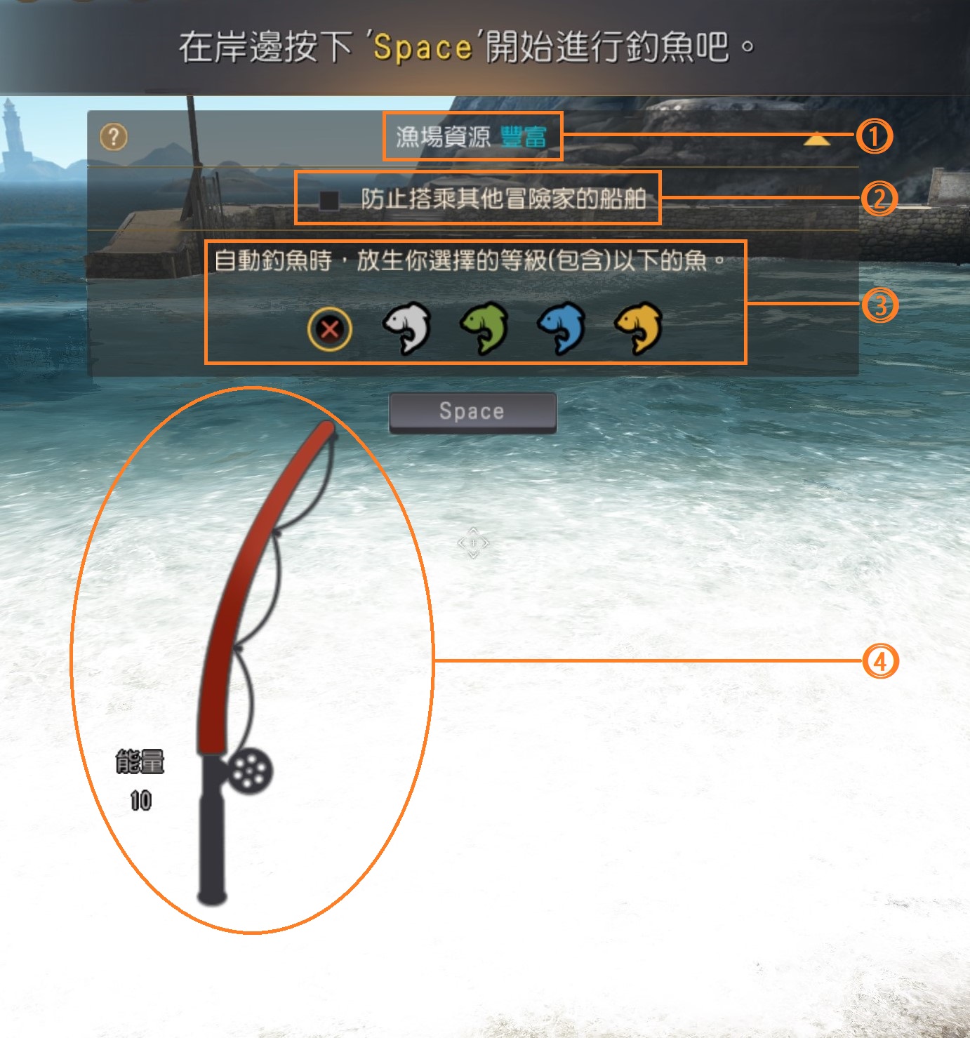这是能量消耗条。按著空白键的话最多会上升到10, 能量消耗越多钓到额外鱼的机率也会上升。 |