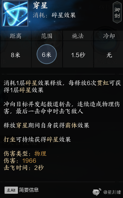 穿星:流派核心,位移,霸体,伤害,每释放六次贯虹可释放一次穿星,非战时打坐会回满,可重置贯虹