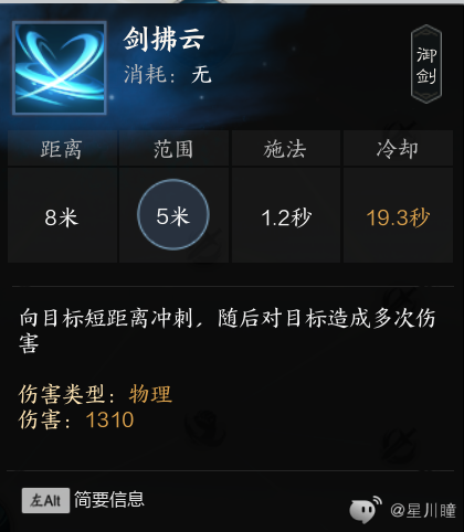 剑拂云:位移,低伤,可重置贯虹,点天书分支后释放可提升15%物理伤害