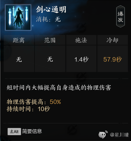 剑心通明:流派核心,buff,释放后提升50%物理伤害