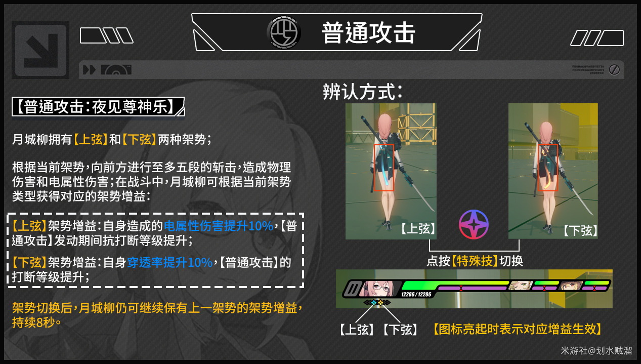 月城柳【普通攻击】切换架势增益的持续时间与核心技中额外能力提供的增益时间相同,因此在实战中,只需要考虑在8秒内切换架势即可吃自身所提供的增益;