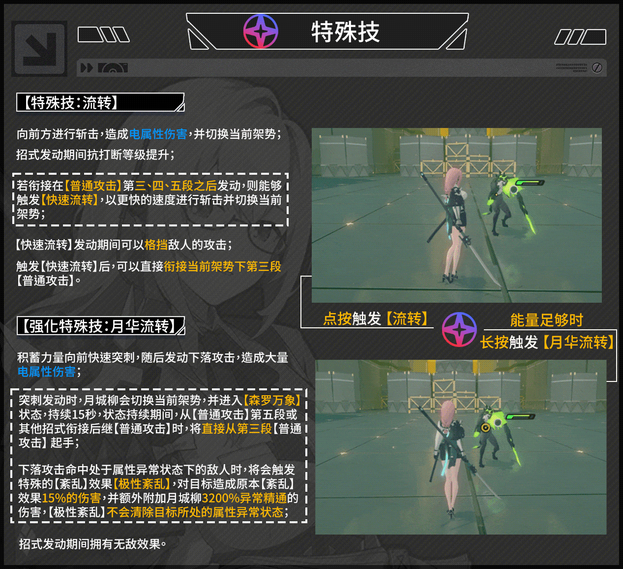 而切换架势时若为第三、四、五段【普通攻击】,则会衔接下一段架势的第三段【普通攻击】开始释放;而月城柳第一、二段为物理伤害,后续为电属性伤害,在第三、四、五段后切换架势也很好的避免了打出物理伤害减缓属性异常的积累,因此通过后三段【普通攻击】架势切换再衔接后三段【普通攻击】可以做到全程电属性伤害并同时保持双架势增益以及额外能力所带来的异常积蓄值效率的提升。