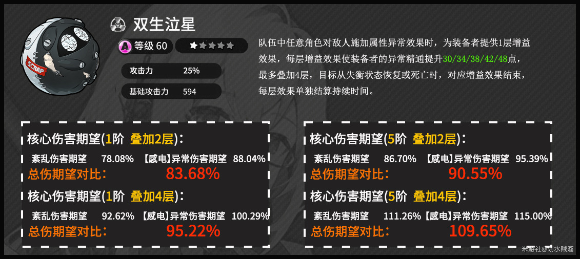 在不考虑专武属性异常积蓄效率的提升情况下,5阶的【双生泣星】在叠满4层的情况下会由于专武,但在实战中考虑敌人血量以及韧性条的的因素,以及异常伤害的机制,4层效果再覆盖率上并不是特别高,因此在实战中想要超越专武的伤害,还是比较困难的,若在纳入异常积蓄效率的提升后,在长线作战的情况下,专武与【双生泣星】的差距进一步拉大。