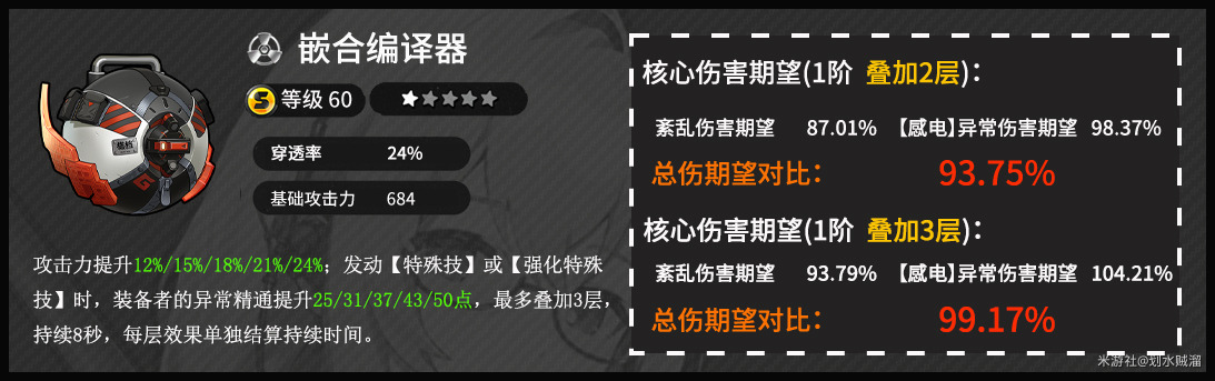 在不考虑专武积蓄效率提升的情况下,【嵌合编译器】与专武的差距相对会比较小,同时每层提供的精通收益持续时间与月城柳切换架势的持续时间一致,也可通过架势增益的持续时间判断【嵌合编译器】的增益持续时间;