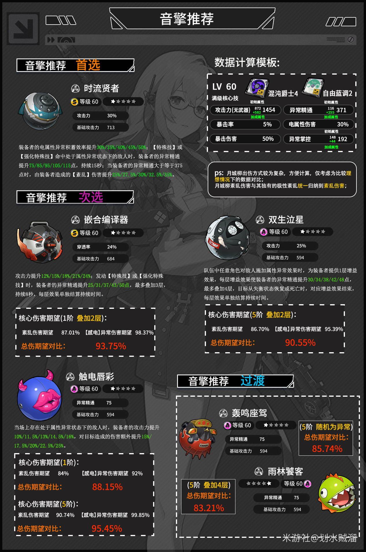 月城柳与柏妮思类似都是扩展玩法体系类的角色;月城柳核心目前来看还是以异常紊乱的玩法为主,但目前比较契合月城柳玩法的异常角色目前比较少,机制上比较契合的只有近期柏妮思,走纯感电单核输出玩法的话,目前可选角色也不是特别多,个人感觉还是后续扩展更多其他玩法体系后会有更多的选择,比较偏向未来可期一点的角色