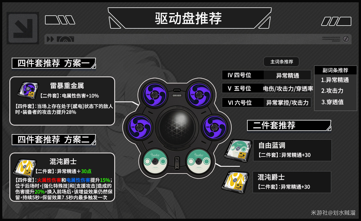 角色上可以选择异常队伍比较通用的赛斯提供精通和降低敌人的异常积蓄抗性,同时提供护盾保障一点的生存能力,驱动盘选择自由蓝调进一步加快积蓄效率,同时也可以保障赛斯累积的异常属性伤害不会太低,三号位上可以选择丽娜配合【下弦】提供的穿透收益以及驱动盘五号位选择穿透达成较高的穿透属性的收益,亦或者选择亲衣这类击破类角色加快敌人进入失衡状态,提高爆发时的伤害。