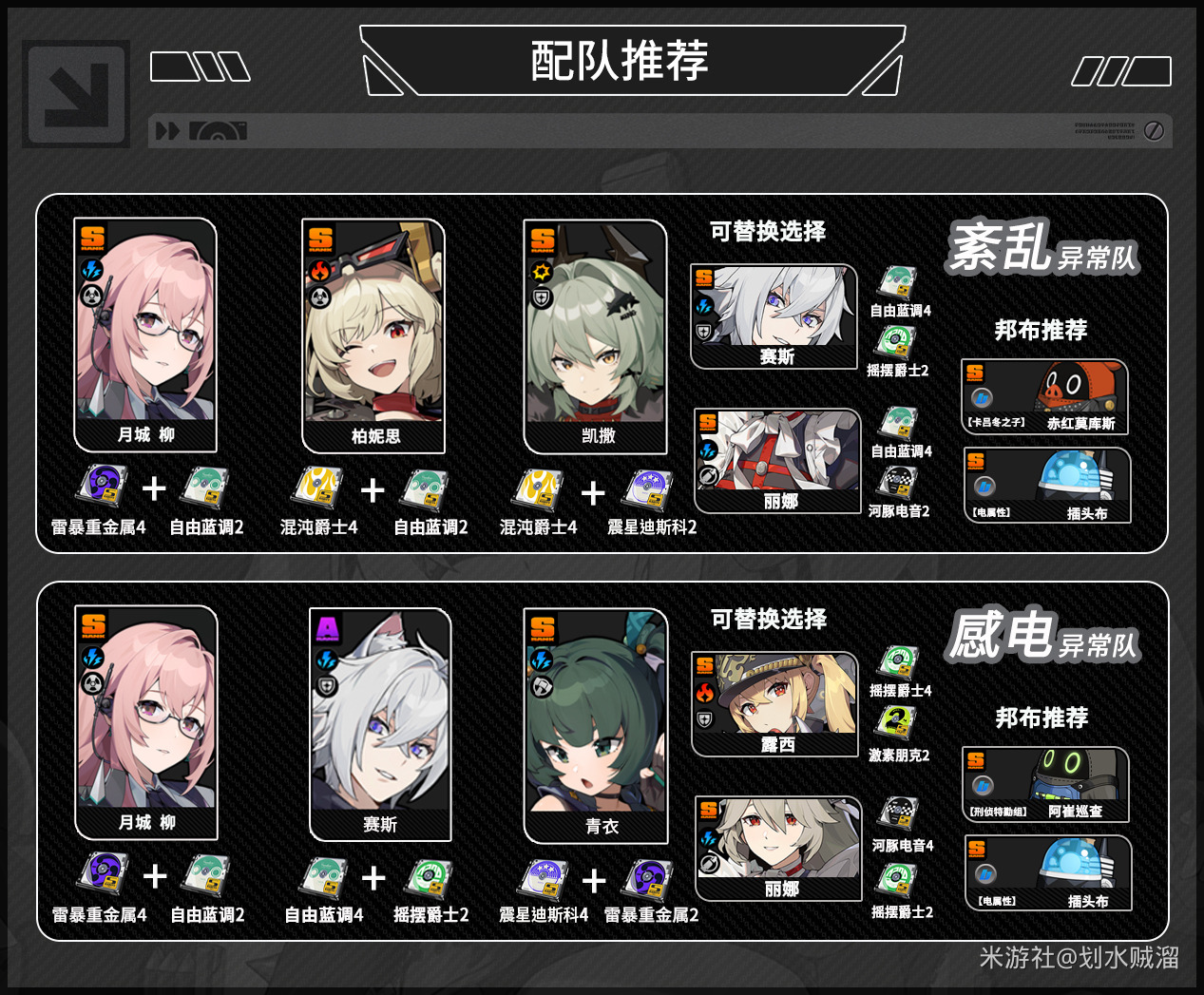 月城柳在配队上大致可以分为两个方向,一是双异常角色主打紊乱伤害,二是以月城柳为核心,主要以月城柳站场打极性紊乱。
