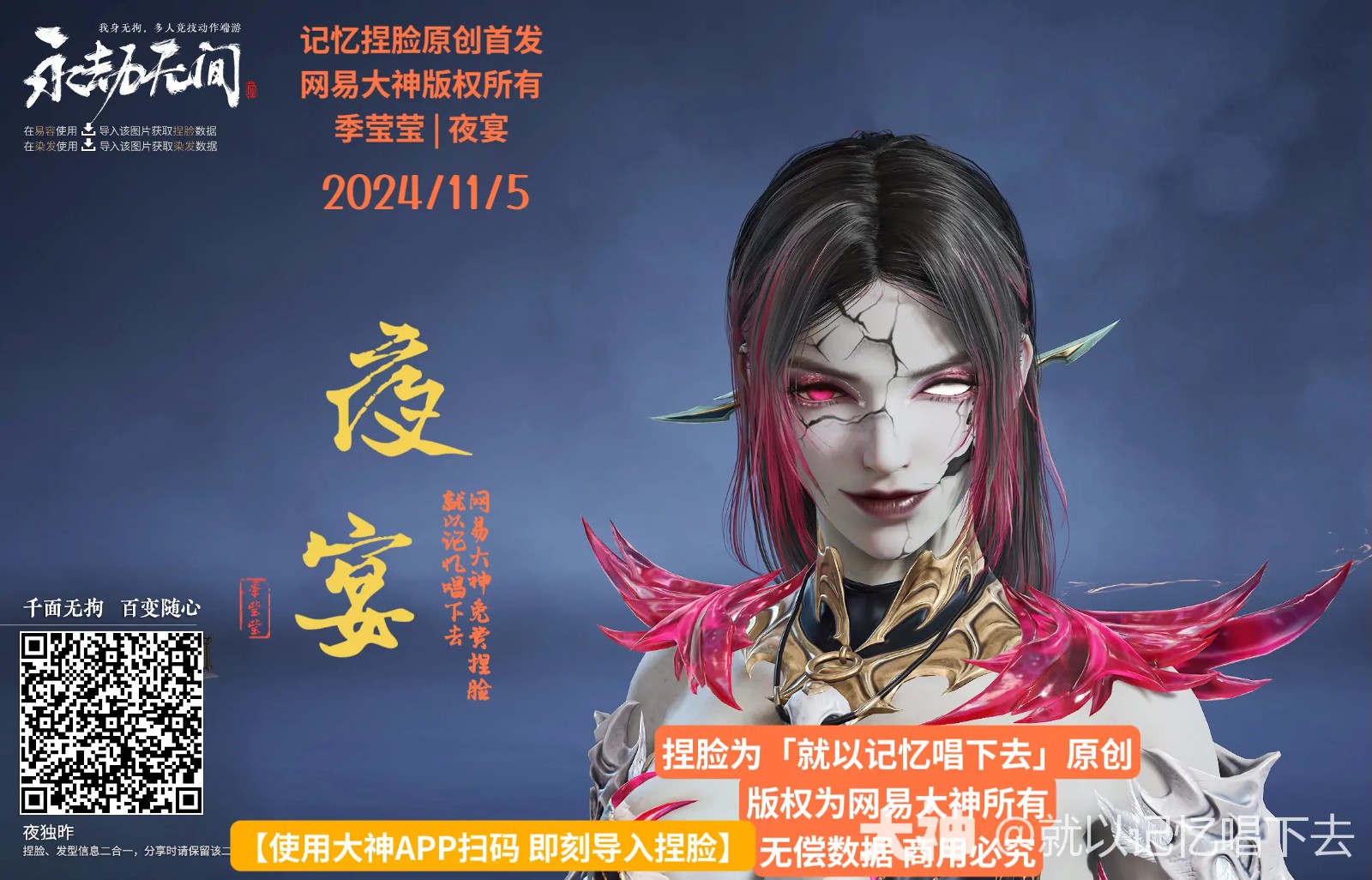 要说这捏脸,那可是《永劫无间》里的一大乐趣,让你充分发挥想象力,把游戏角色打造成独一无二的崽。今天,就给大家带来一份“夜宴”主题的季莹莹捏脸秘籍——二维码一份!保证让你家的莹莹小姐姐,在聚窟洲的夜场里,成为最靓的崽!