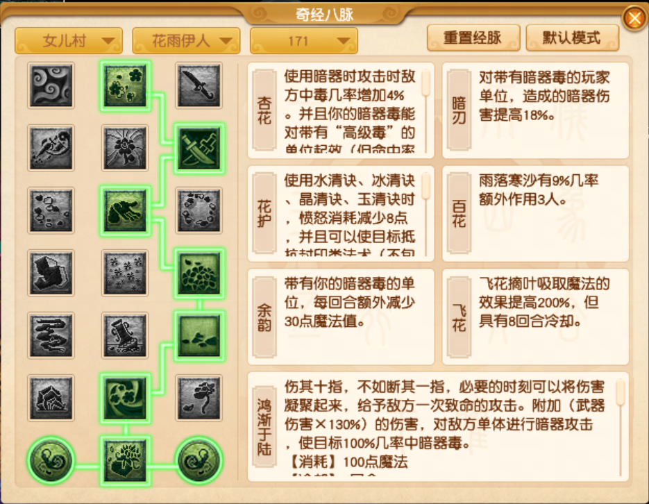 加点理由: 在PK中,花雨伊人更侧重于“挂毒控蓝”,通过持续的消耗来压制对手。所以要选择一些能增强压制效果的经脉,比如【杏花】和【暗刃】。