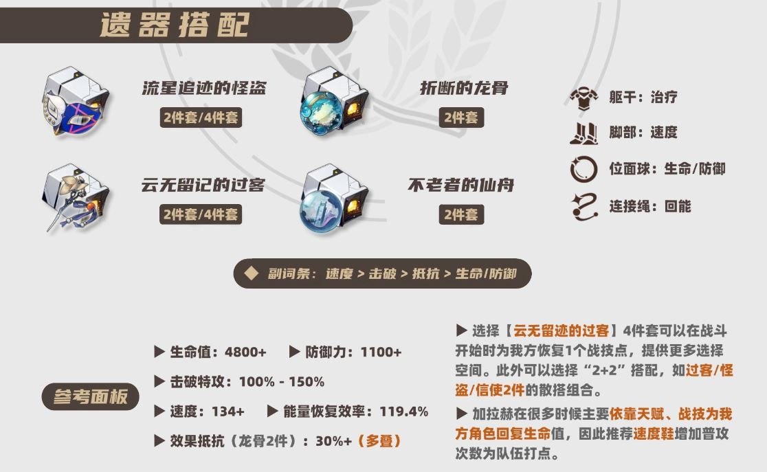 “云无留迹的过客”四件套: 这套呢,不仅能提高奶量,还能在开局给队伍送一个战技点,相当于给队友提前预支了一次“免费攻击”的机会,让输出更流畅,容错率更高!