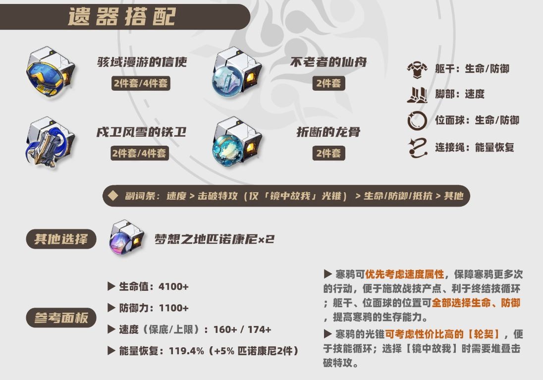 总而言之,言而总之,寒鸦妹妹的遗器搭配,就是要围绕速度、生存和能量恢复效率这几个关键词来展开!各位开拓者们,赶紧行动起来,打造属于你的最强寒鸦吧!让她在星穹铁道上,成为你队伍里最可靠的战术大师和增益小能手!