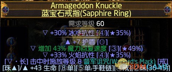 珠宝:勘察之眼,生命词缀+元素点伤(攻击附加或法杖附加点伤,不能有火焰伤),强烈建议珠宝中带一个高roll的攻击致盲敌人,提高生存。