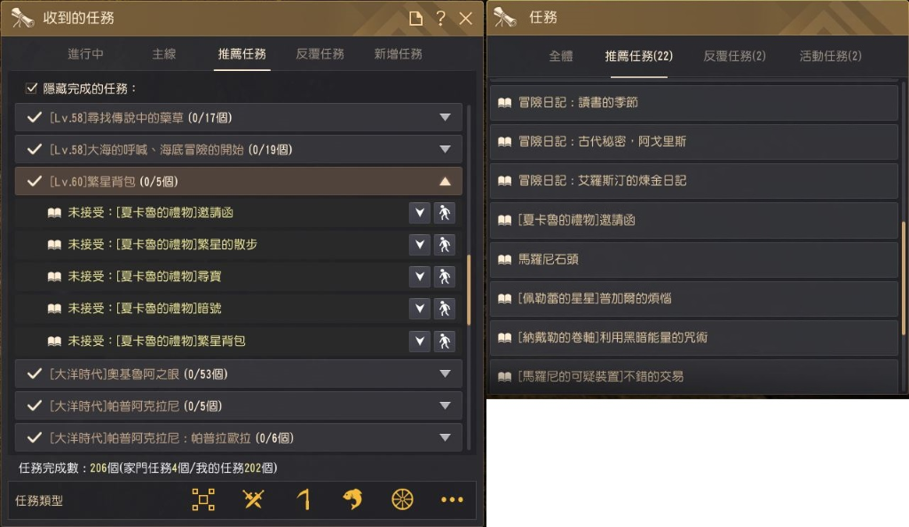 ▲任务(O) - 推荐任务 (左) / 黑精灵推荐任务 (右)