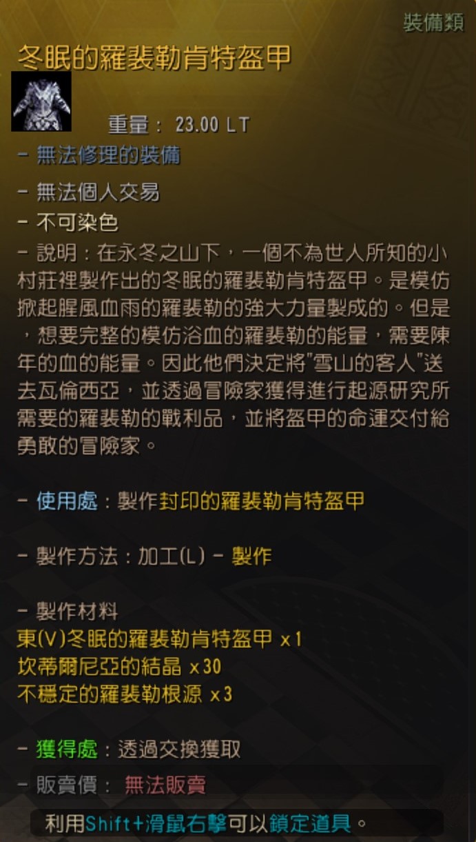 - 简易炼金(L) 东(V)罗裴勒肯特盔甲 + 坎蒂尔尼亚的结晶30个 + 不稳定的罗裴勒根源3个 = 封印的罗裴勒肯特盔甲!
