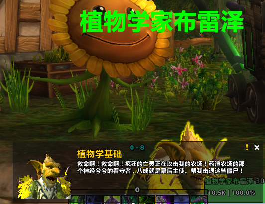 在房子门口,你会发现一个鬼鬼祟祟的地精,他就是我们的NPC——“布雷泽”。和他对话,接下任务“植物学基础”,然后...Duang!你正式开启了《魔兽世界》版的“植物大战僵尸”小游戏!