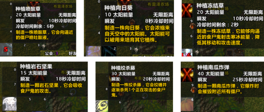 游戏里一共有六种植物,它们分别是:豌豆射手、向日葵、寒冰射手、坚果墙、大嘴花和樱桃炸弹。好好利用它们,你会发现僵尸什么的,根本不在话下!