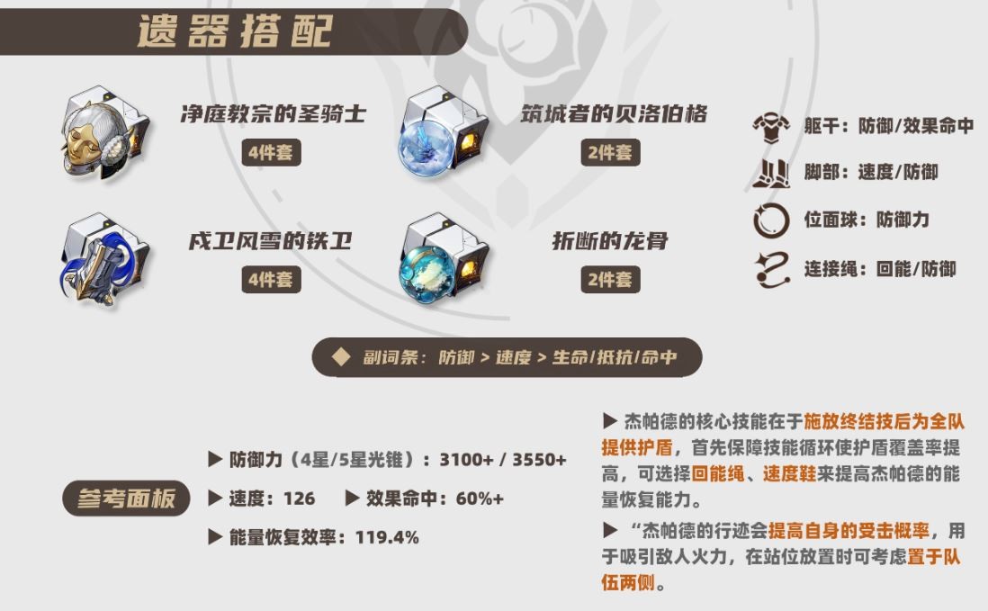 至于副词条,防御、速度、效果抵抗都是好东西,多多益善!如果你想让杰哥的战技冻结敌人更靠谱,那就堆点效果命中,让敌人尝尝冰冻的滋味!