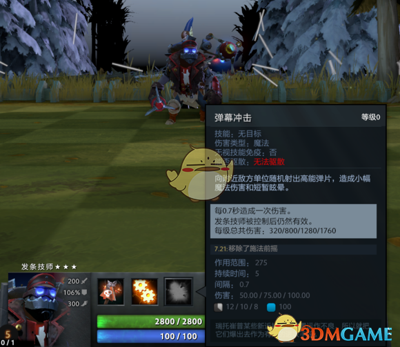 技能: 弹幕冲击 - 咻咻咻,对着随机目标一阵乱射,造成短暂眩晕和持续伤害。