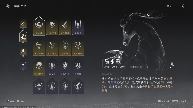心法: 让武学发挥更大作用的辅助技能,可以提高输出武学的伤害,增强肉盾武学的防御,或者提升奶妈职业的治疗量。