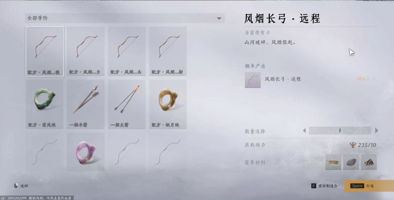 攻击套装和防御套装弓箭和射玦可以在背包中制作,弓箭的配方需要打试剑中的团本来获取,射玦的配方在每次等级突破时就会自动获得。