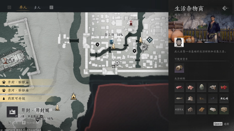 粗矿石和粗毛皮需求量巨大,可以在生活杂物商处购买,每周刷新99个,建议前期多收集并且每周扫空商店。生活杂物商在清河和开封各有一个,位置如图。