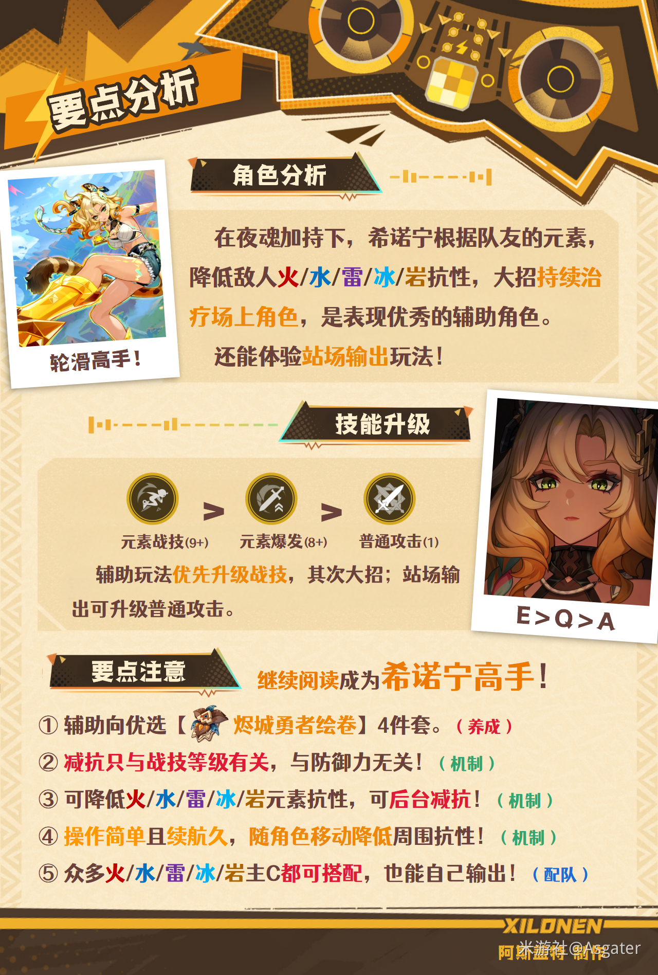 希诺宁是「五星岩系泛用辅奶C」,可以提供多元素减抗的辅助,根据队伍构成,也可以进行站场输出。那么有小伙伴好奇希诺宁怎么培养,那么下面就给大家带来希诺宁培养攻略。