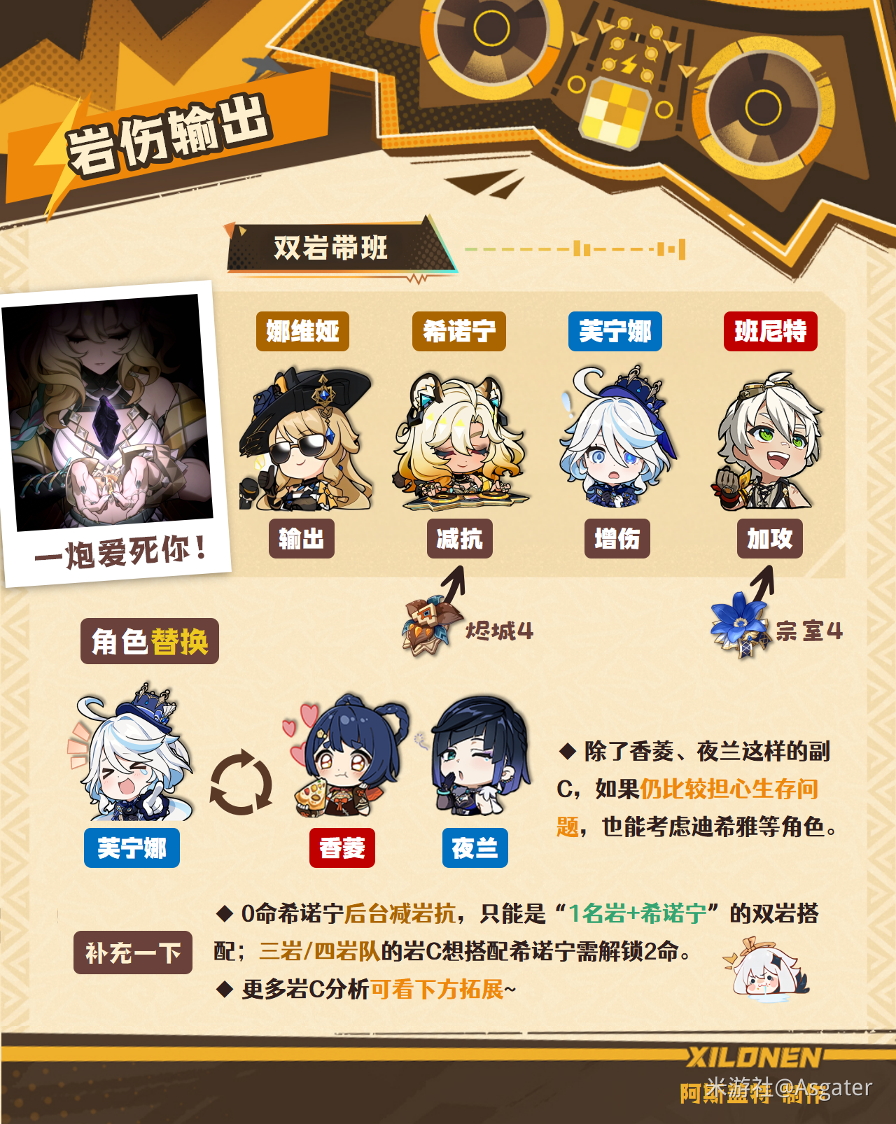② 希诺宁作为岩伤输出时(三岩队),此时希诺宁可选【黑曜4】、卡齐娜依旧【勇者4】提供增伤。