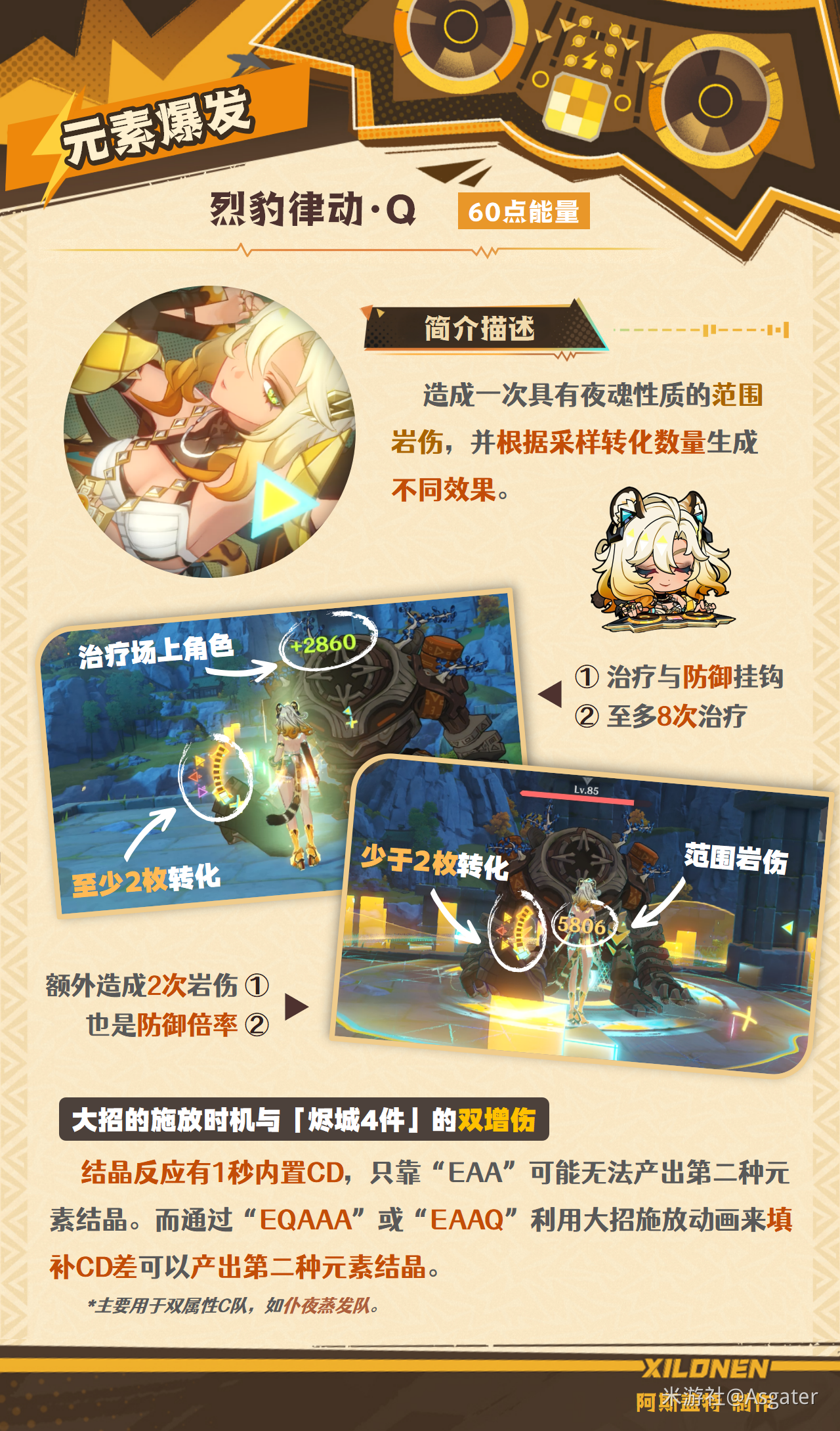 她的元素爆发会造成岩元素范围伤害,并根据队伍构成,对当前场上角色进行持续治疗或造成额外两次伤害。