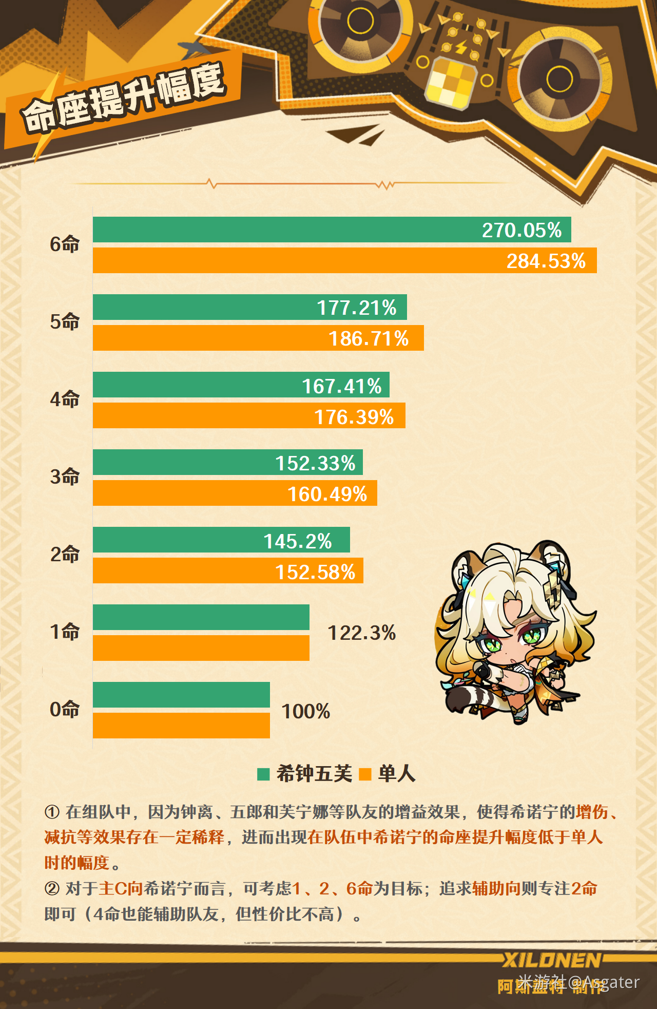 ② 对希诺宁的岩伤站场提升非常大,配合战技、命座,6命希诺宁的输出非常强劲!