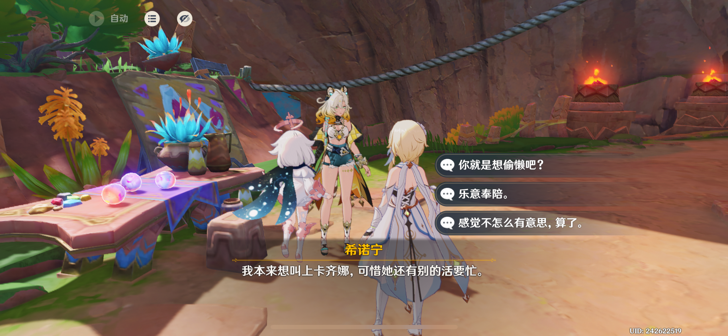 第一天嘛,必须安排上试用角色希诺宁!为了增加点胜算,我还特意带上了卡齐娜,双剑合璧,抓虫不累!(虽然感觉卡齐娜可能更想去拆家...)