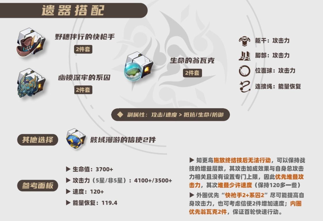 ①当前最流行的搭配,就是“快枪手”两件套加上“系囚”两件套,简单粗暴,直接堆攻击!让知更鸟的歌声更具穿透力!当然,如果你是个“非洲人”,遗器副词条死活刷不出速度,那就试试“信使”两件套吧!毕竟,咱们的目标是激活内圈“翁瓦克”的效果,让知更鸟早点开嗓,给队友们来一首激昂的战歌!