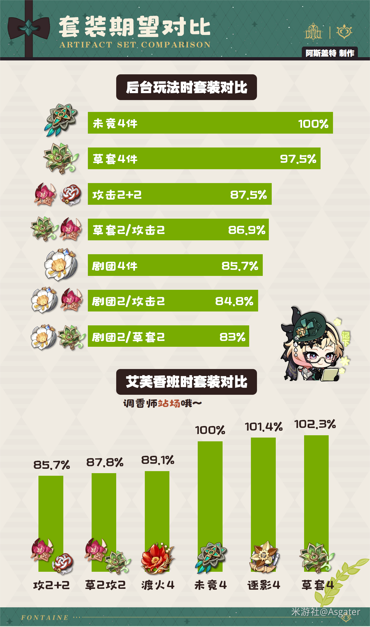 ① 如果队友没人带【草套4件】,“调香师”可以自己带(和昔时之歌差距最小)。