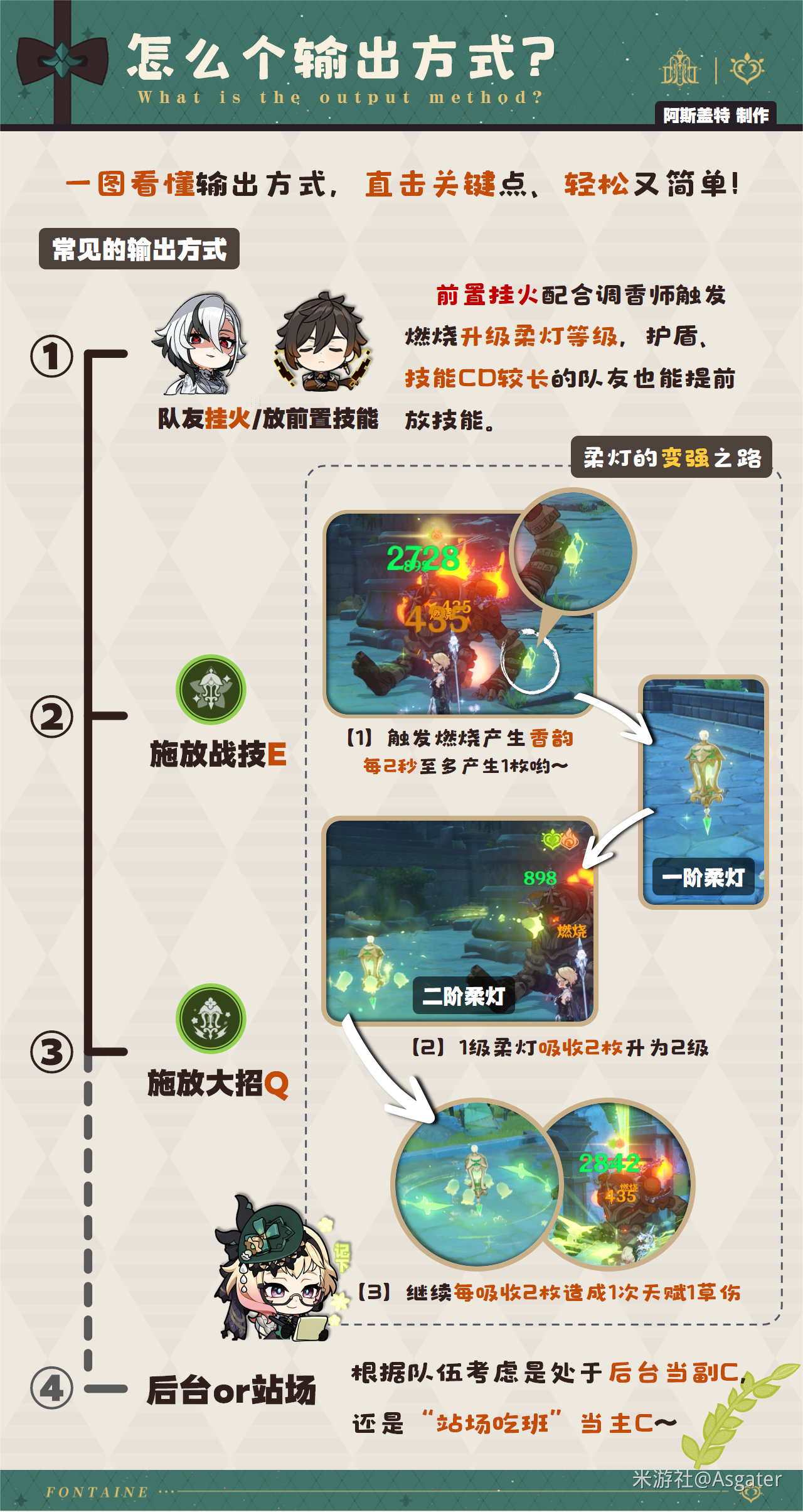 ② 推荐在柔灯升到二阶后再释放大招,这样二阶柔灯可以打出更多次天赋1的草元素伤害。