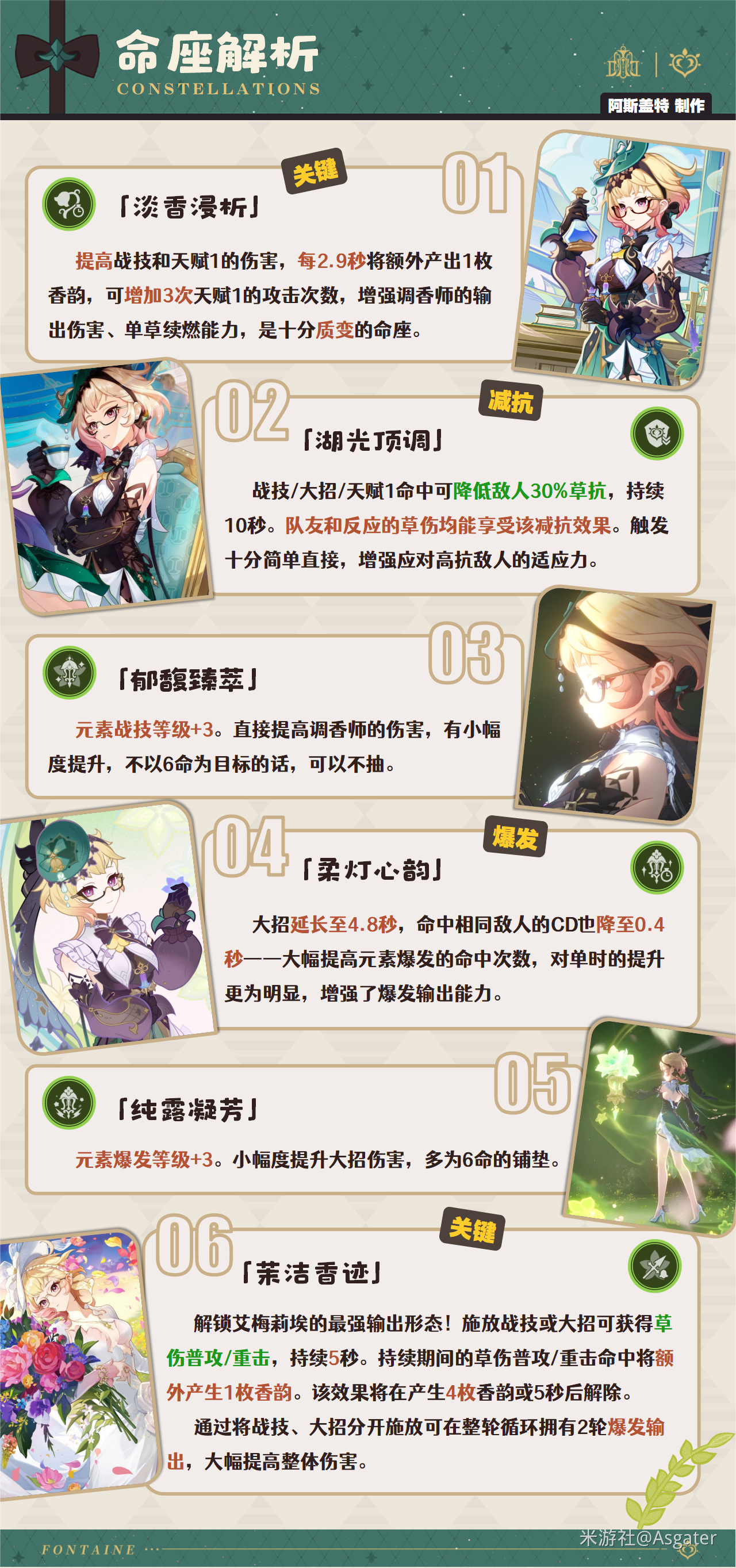 ① 该命座的关键在于额外产生【香韵】,加速柔灯触发天赋1的效果,提高伤害,同时打出的草元素伤害普攻/重击也能补充“调香师”的伤害。