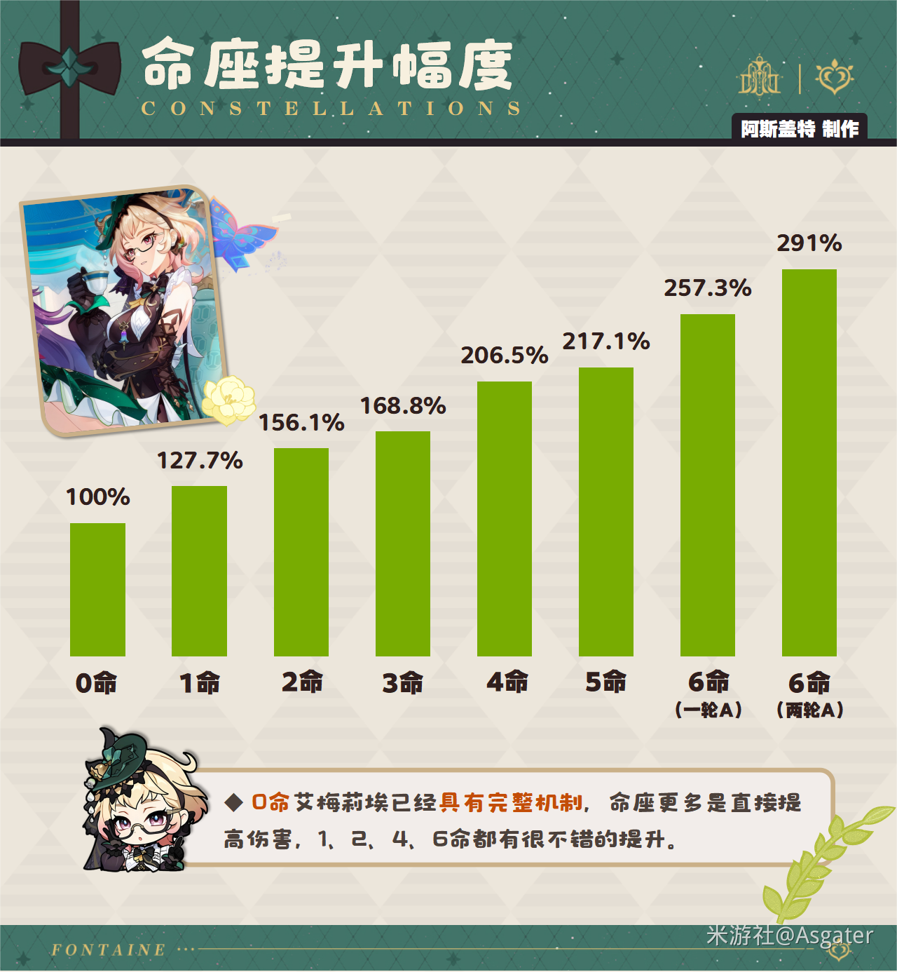 ② 艾梅莉埃的技能倍率很高,但燃烧伤害这玩意儿,她自己又没啥加成手段,所以还是以草元素伤害为主。