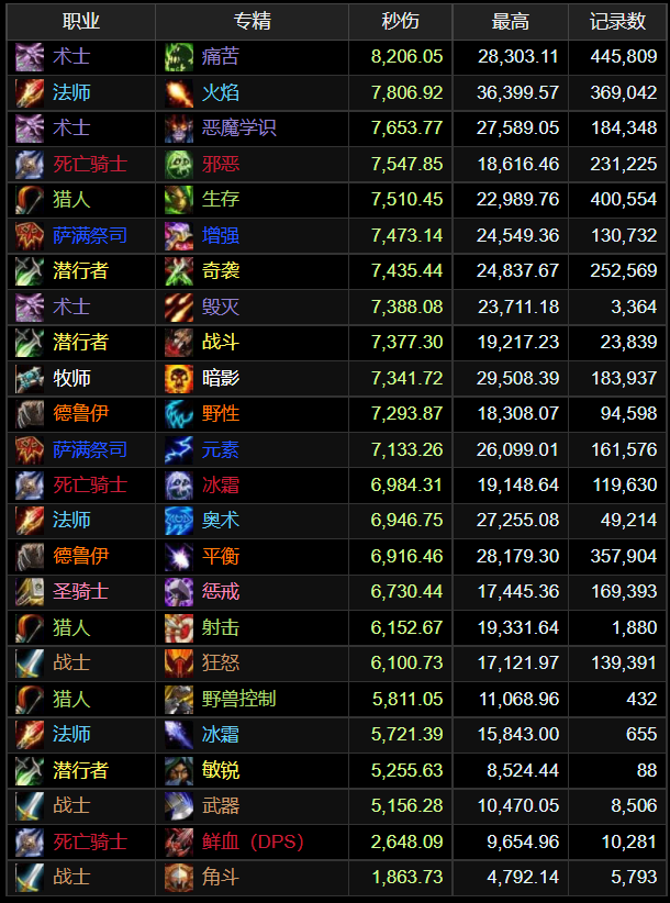 再来看看最高伤害记录的排名,和整体百分比排名基本一致,痛苦术士依旧是傲视群雄,将其他职业远远甩在身后! 火法、暗牧、刺杀贼和狂暴战这几个职业在最高记录榜单上的表现比整体百分比要亮眼不少,看来上限还是有的,就看你能不能把他们玩出花了!