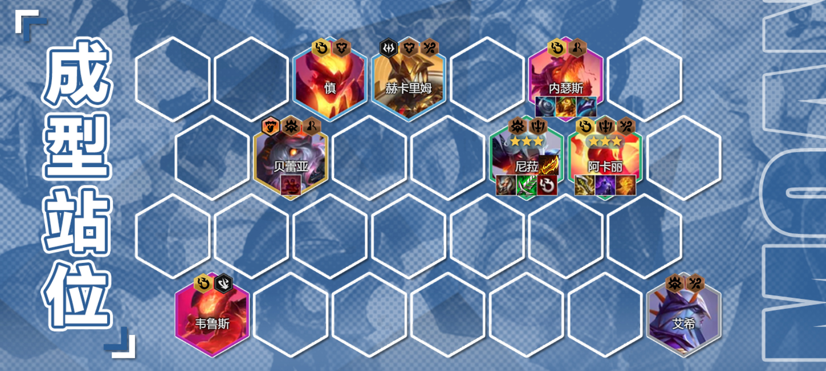 站位方面,尼菈和阿卡丽要像两把尖刀一样,从敌方最薄弱的地方切入,快速减员是关键。但要注意躲避敌方的控制技能,别让双C被控到死。