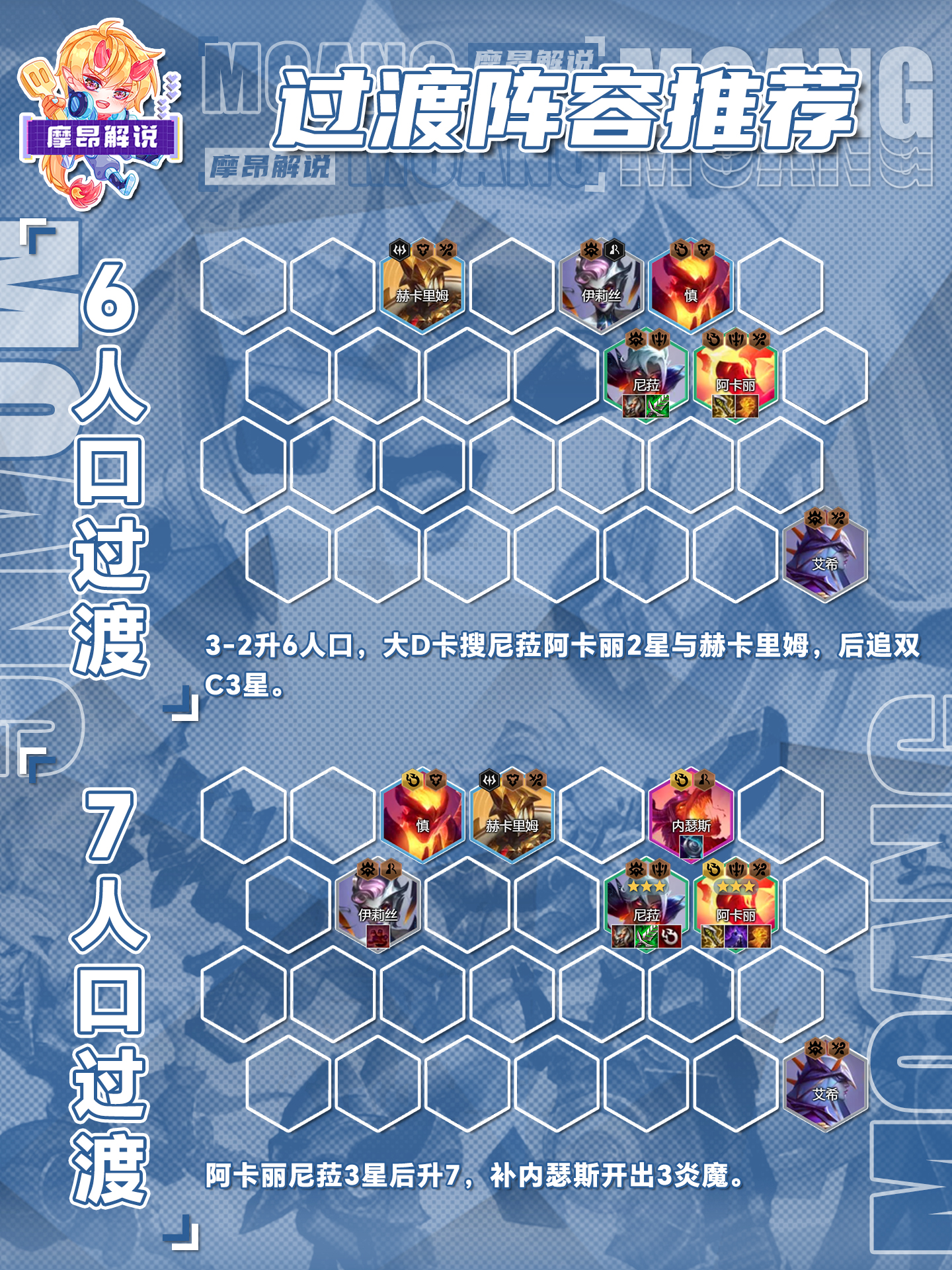 3-2:升6人口,疯狂D卡,搜到尼菈、阿卡丽2星和赫卡里姆。之后根据局势,卡着30-50金币,追阿卡丽和尼菈3星。