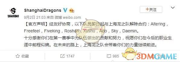 前排的Roshan、Xushu;输出的Ado、Daemin;辅助的Altering、Freefeel、Sky、Fiveking均被解约。最让人感到意外的是韩国选手Ado的解约,作为上海龙之队在第一赛季中少有的表现亮眼的选手,很多人都认为Ado能够留下,然而结果却并非如此。最近有传言说Ado正在首尔王朝队的基地逗留,一时间,很多人怀疑这是否意味着Ado与首尔王朝队建立了某种联系。不过,截至发稿时我们仍未获得更确切的信息。