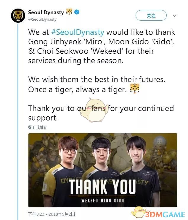 2018年9月2日,首尔王朝队官方推特宣布与主T选手Gong“Miro”Jin-hyuk、辅助选手Moon“Gido”Gi-do、自由人选手Choi“Wekeed”Seok-Woo解约。