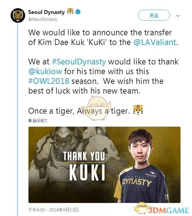 2018年9月13日,首尔王朝队官方推特宣布队内主T选手Kim“Kuki”Dae-Kuk转会至洛杉矶英勇队。