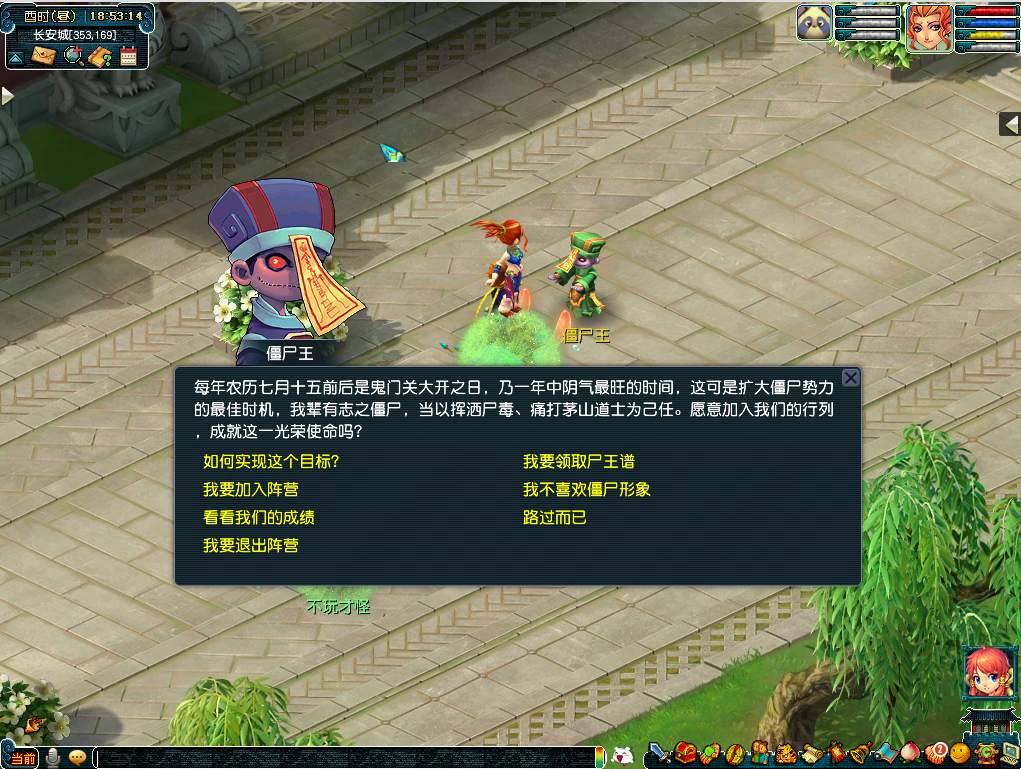 1. 加入僵尸阵营! 在长安城(356,172)找到僵尸王,化身僵尸小弟,感受一下“蹦蹦跳跳”的快乐。
