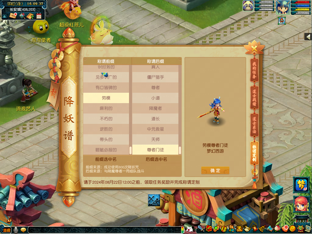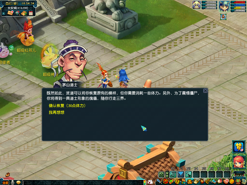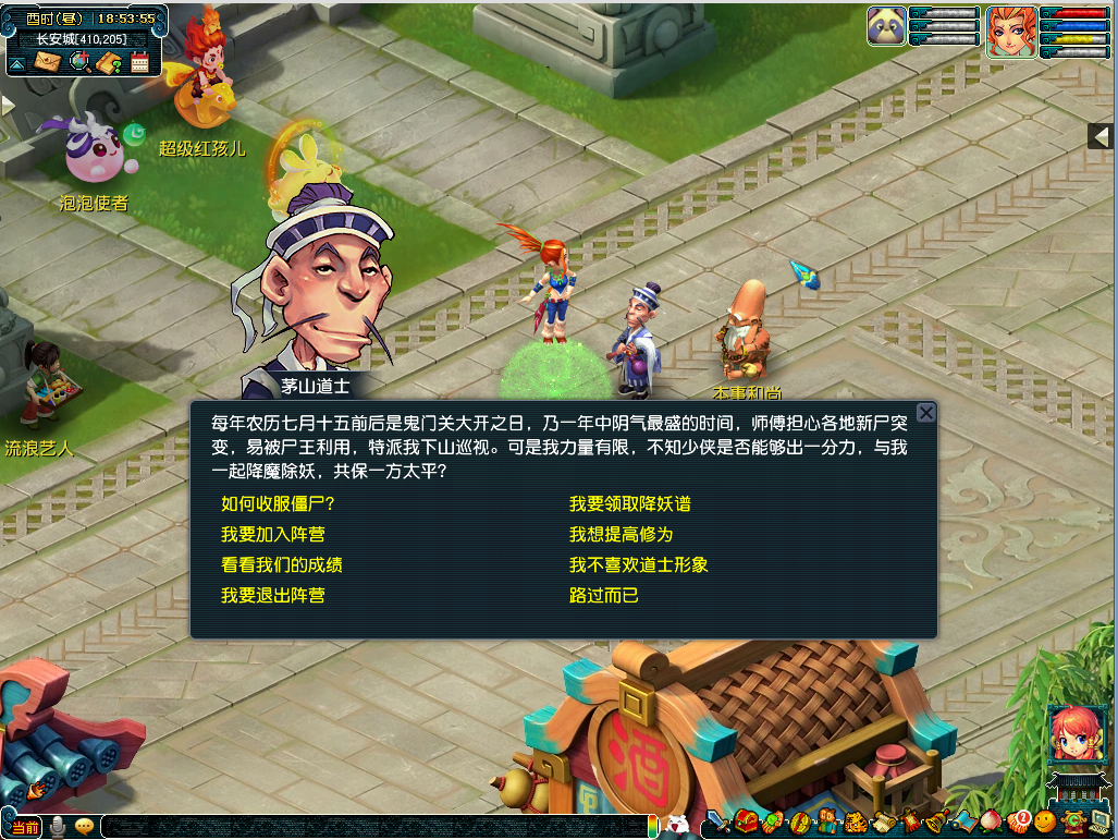 如果你对僵尸/道士的造型不满意,觉得影响了你的颜值,没关系!找到长安城的中元地官(237,113),消耗30点体力,就能恢复你原本的盛世美颜!同时,为了让你更有仪式感,还会送你一个当前阵营的傀儡,让你带着小弟/小妹,威风凛凛地行走三界!
